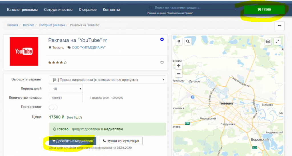 После того, как выдобавили все необходимые виды рекламы в медиаплан нажмите кнопку Медиаплан (корзина с ценой в верхнем правом углу как на скриншоте ниже)