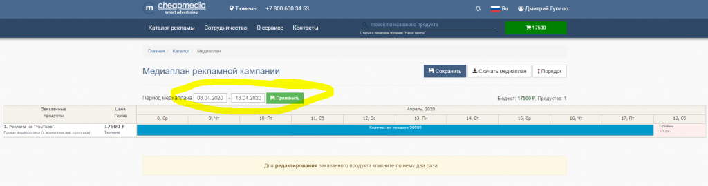 Вам откроется редактор медиаплана, где Вы сможете выбрать когда стартует Ваша рекламная кампания и когда закончится.